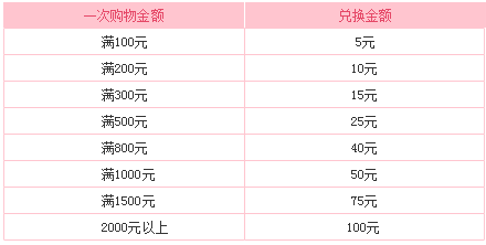 用戶一次購物金額超過100元即可參與積分兌換現(xiàn)金券活動,所得現(xiàn)金券在下次購物時可支付商品金額及配送費(fèi),用戶應(yīng)補(bǔ)齊購物費(fèi)差額部分。